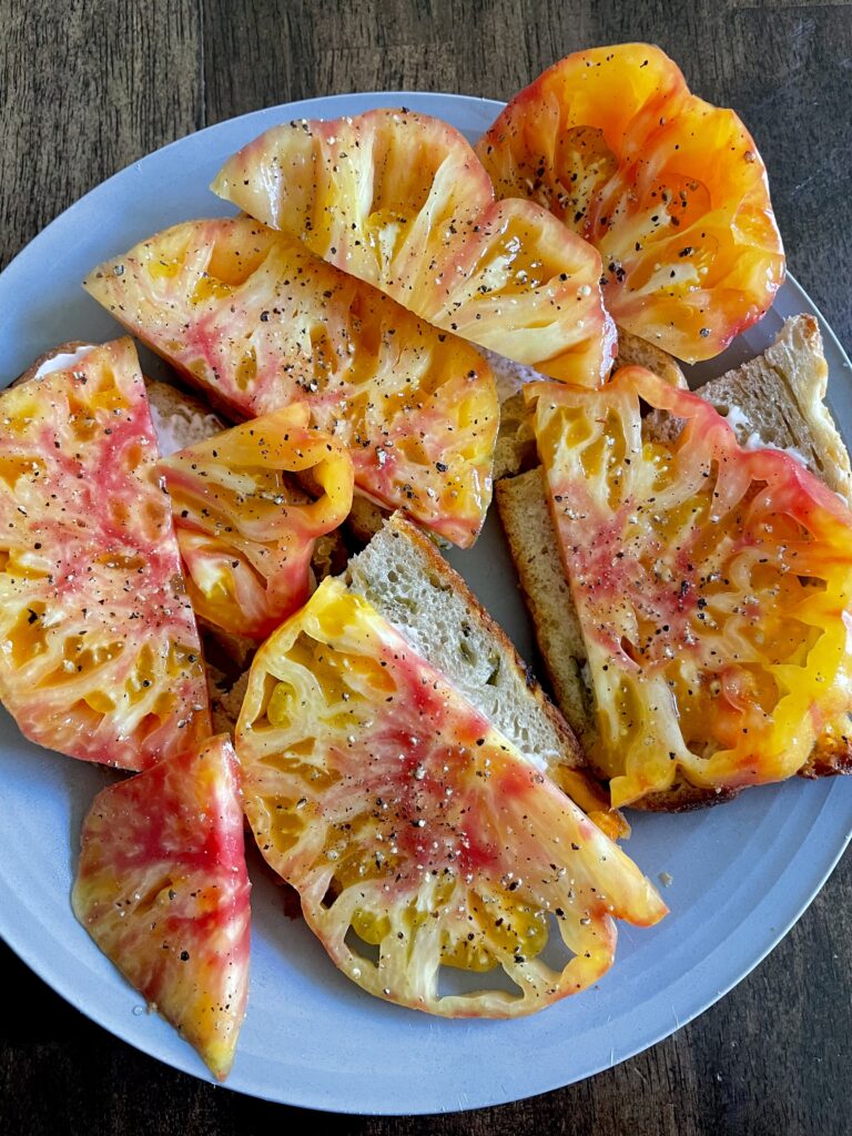 I love eating Old Germans for tomato sandwiches (as pictured). They’re best for slicing and enjoying fresh because of their large size, meaty texture, and sweet, fruity flavor.