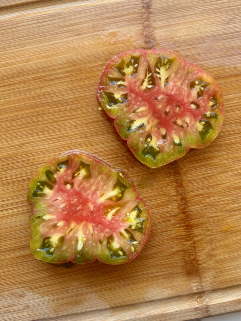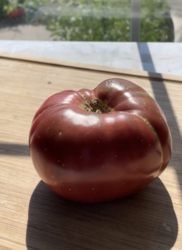 This tomato has a fun name. It means “Black Pineapple” in French (although it’s not black, nor does it look like a pineapple).